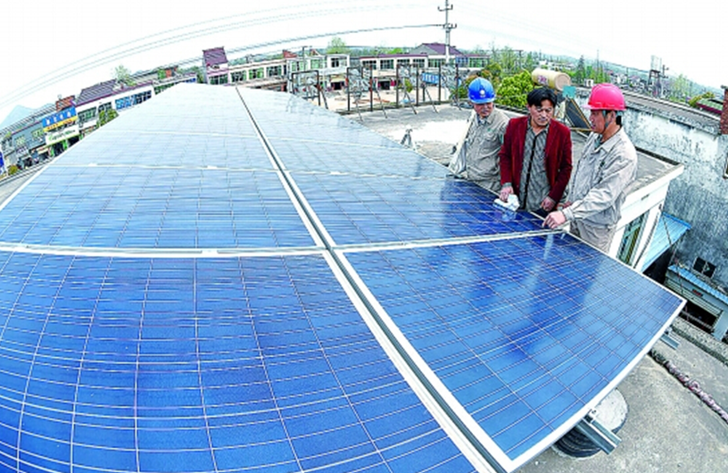 4月9日,廬江電力公司的技術(shù)人員在自建光伏發(fā)電站的農(nóng)民曹大閂(中)家中幫助檢查光伏發(fā)電設(shè)備運(yùn)行情況。
